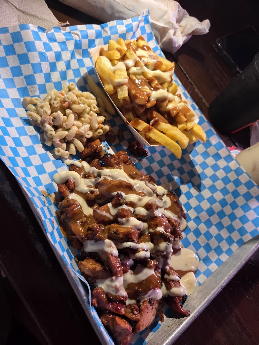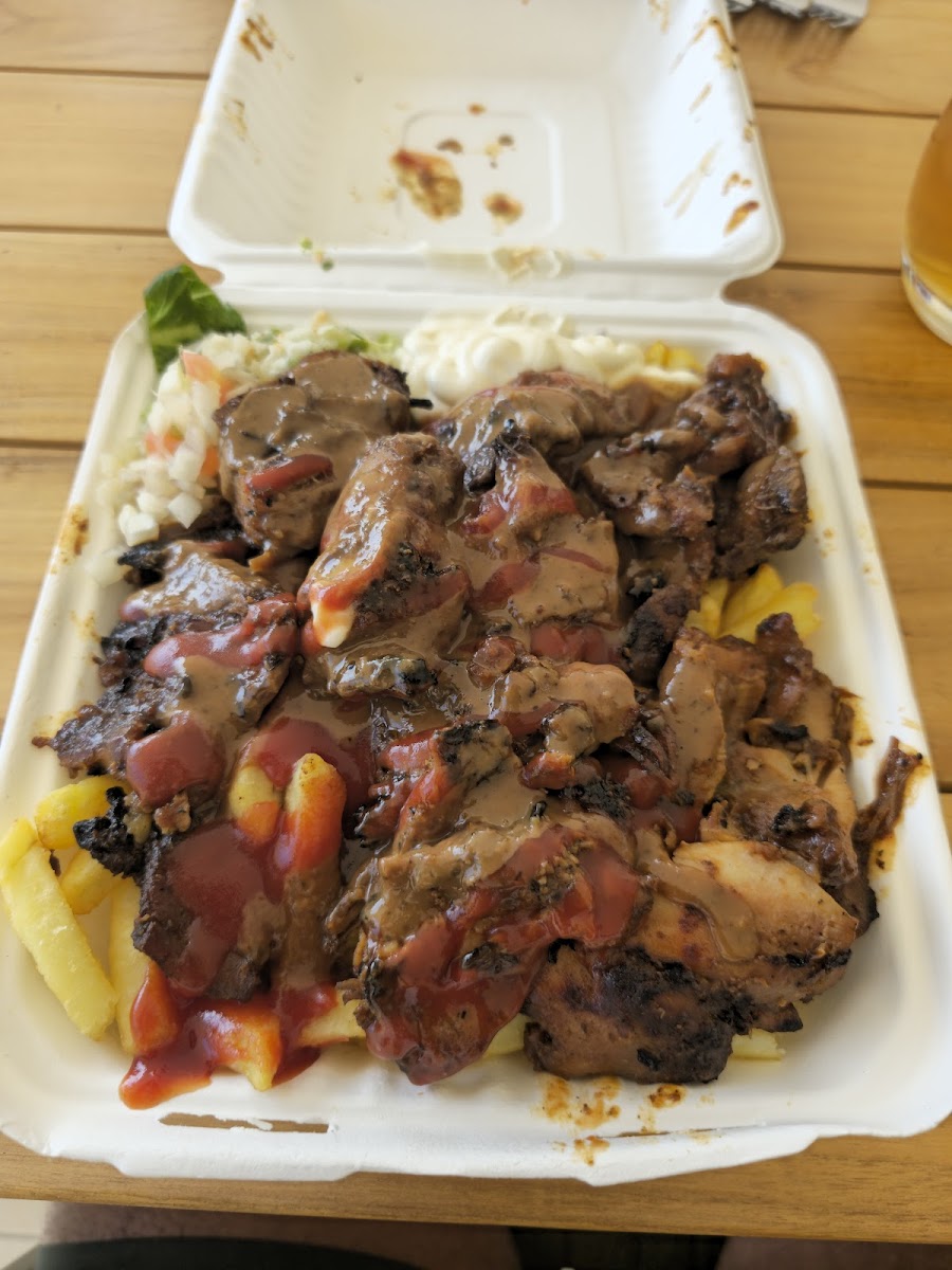 We had such a great time stopping by on our way to the beach. There is a BBQ place which was fantastic. The wings and the ribs were the highlight with lots of different sauces to pick from (I would skip the grilled shrimp). The Mexican place was amazing, best birria tacos I’ve maybe ever had, lots of meat and flavor. Jeremy took care of us at the bar. He was extremely kind and attentive and even made a special shot for us! I can’t recommend this place enough, definitely the best food on the island. We tried to take a picture but ate it all before we could!